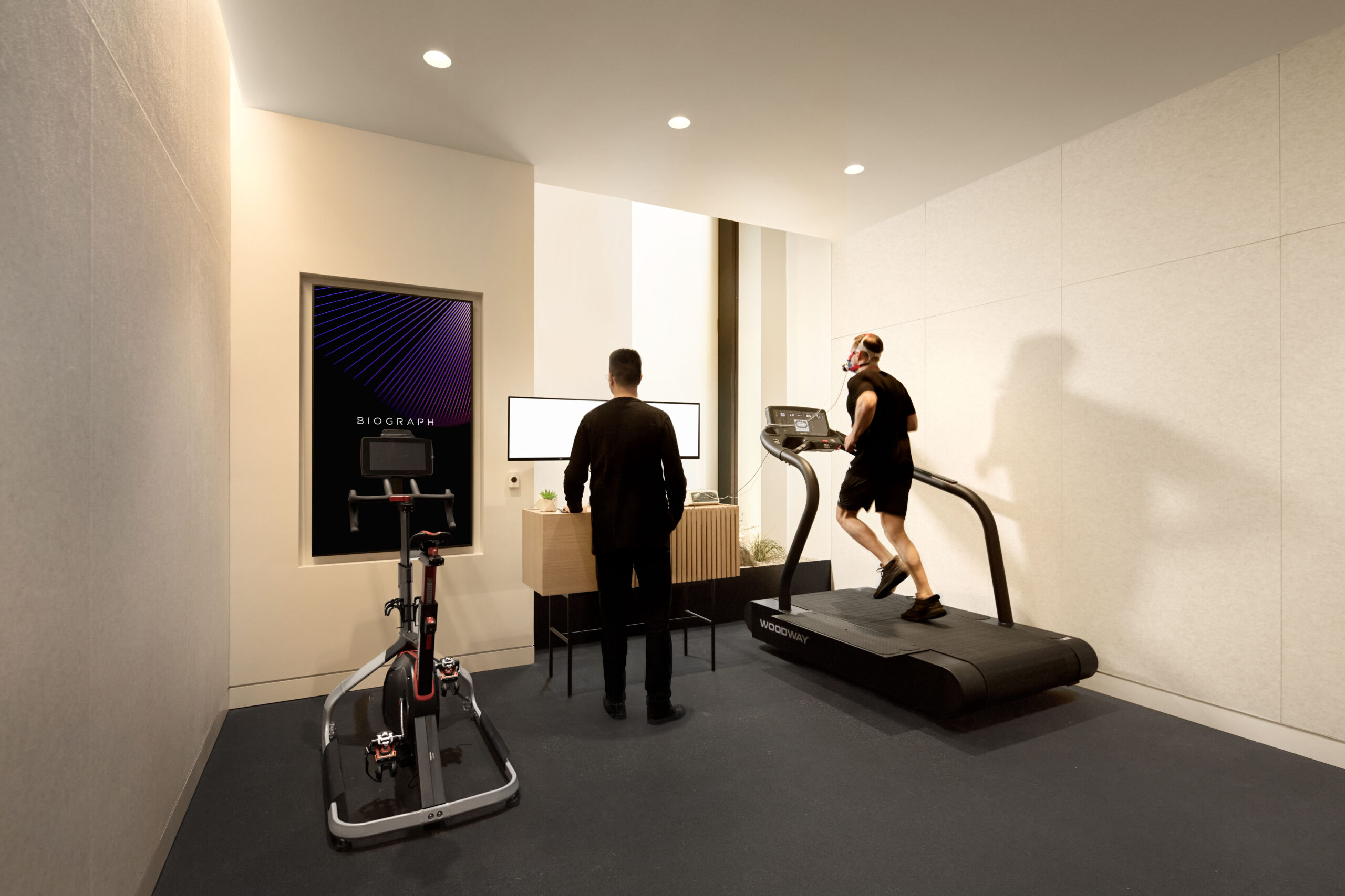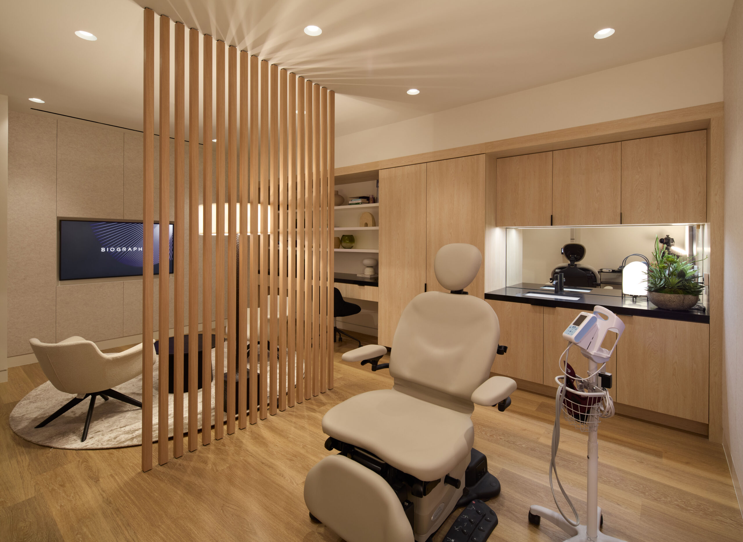 The design challenge was to translate Biograph’s visionary concept into a built environment that offers a profound sense of zen amidst the bustle of a city that never sleeps. Central to this atmosphere is a comprehensive commitment to biophilic design, weaving a deep connection to nature throughout the entire facility, a feature rarely seen in healthcare settings. The facility’s core function remains rooted in high-quality care, featuring a realm of advanced diagnostics, inclusive of their proprietary MRI machines, VO2 MAX, Dexa, CT Scans, and more.