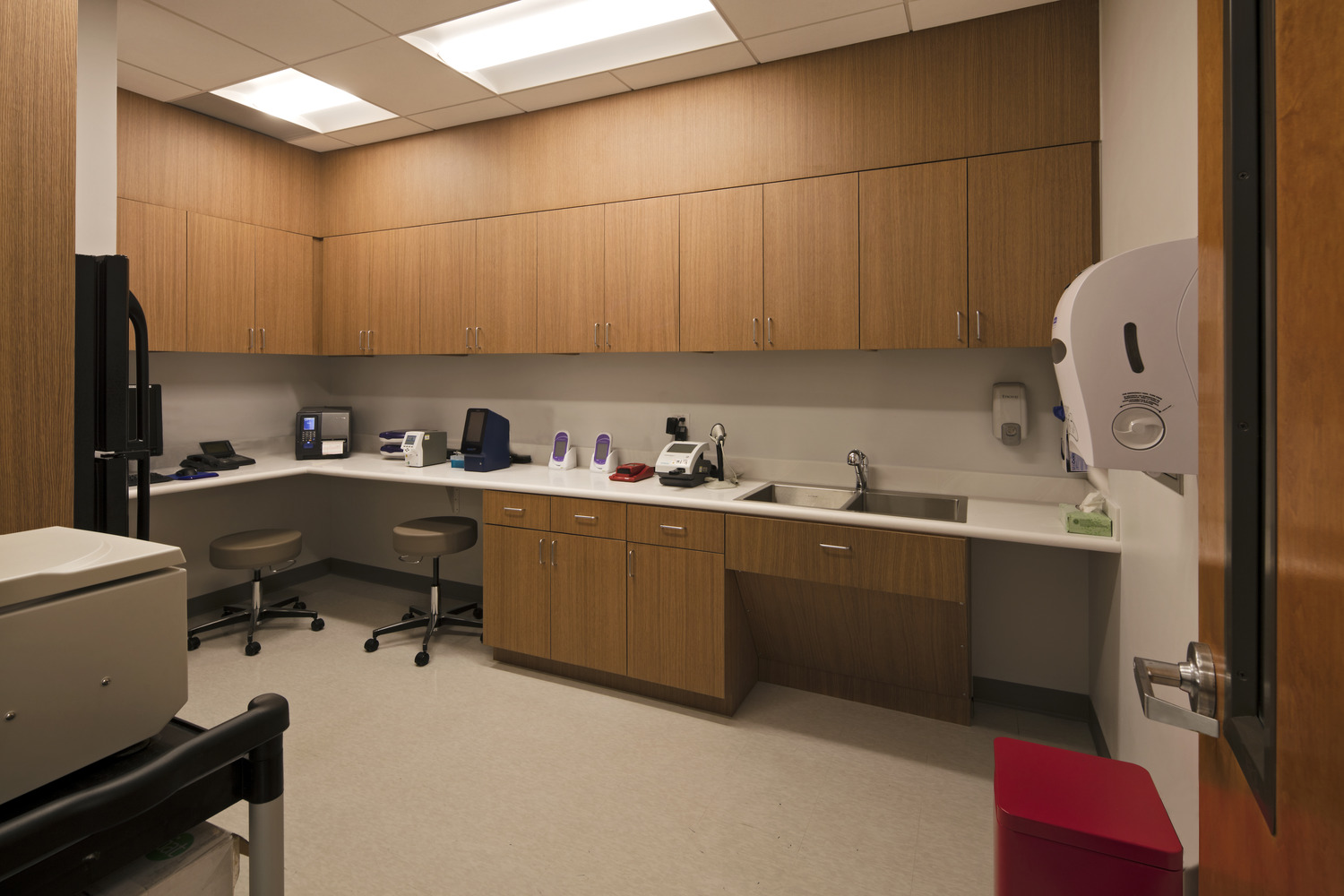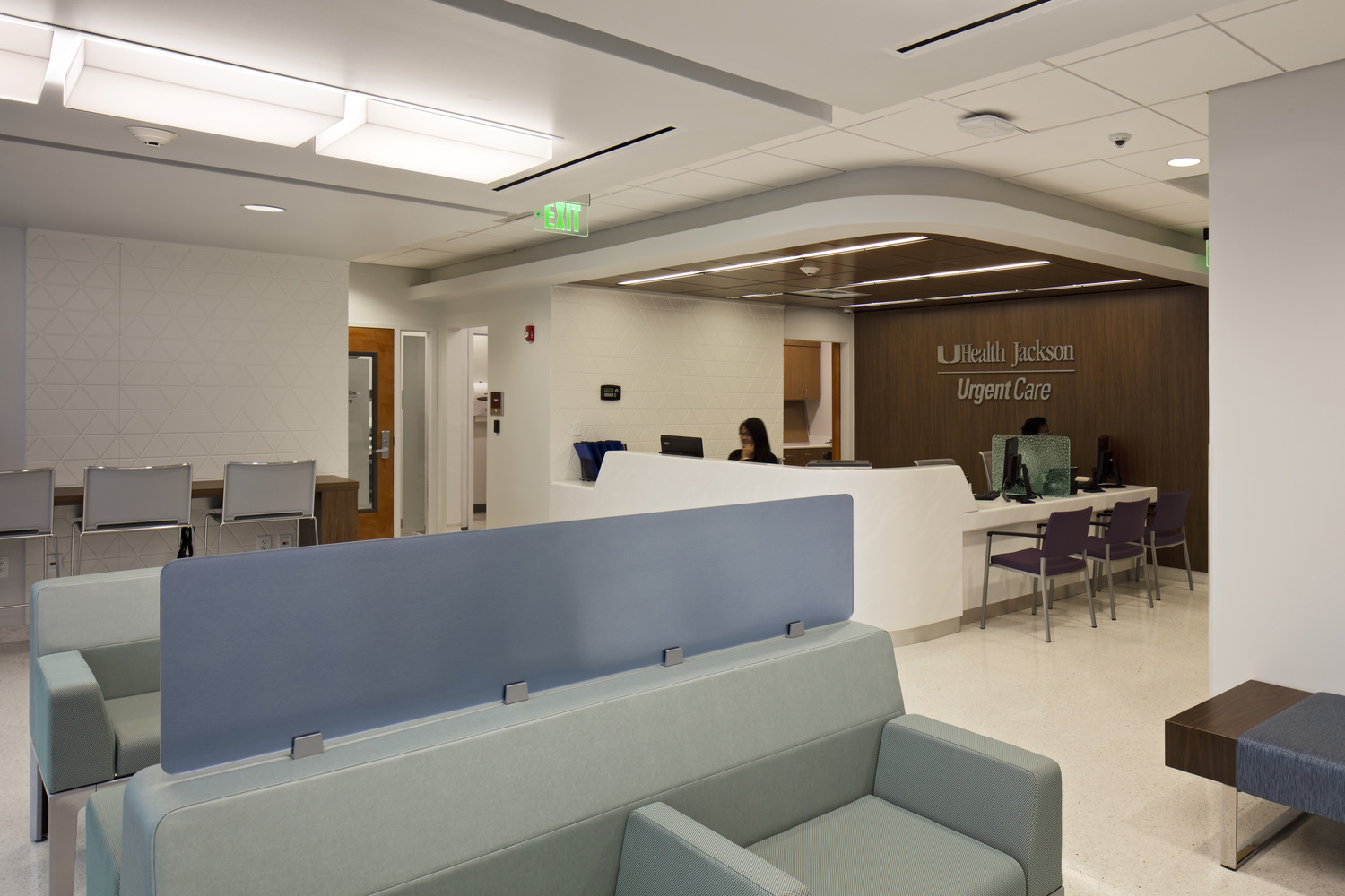 Its efficient design introduces a bright and welcoming Waiting area that maximizes natural light and offers flexible seating—including high-top tables that allow visitors to work while they wait. The registration/reception area is intentionally configured to be both inviting and private, while also enabling minimal staffing. Directly connected to the interior nursing work area, the staff core supports quick, seamless triage, ensuring patients receive care efficiently from the moment they arrive.