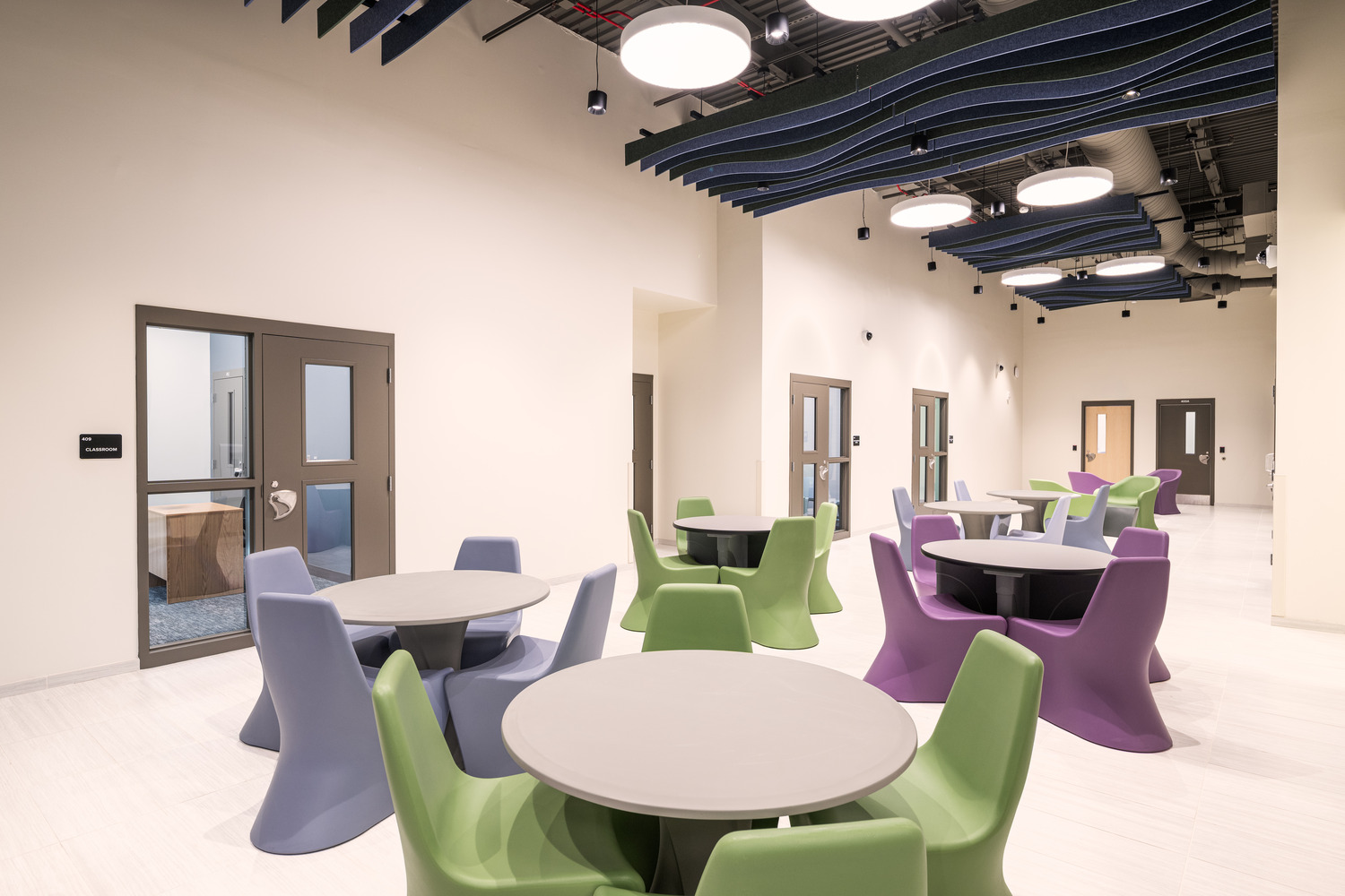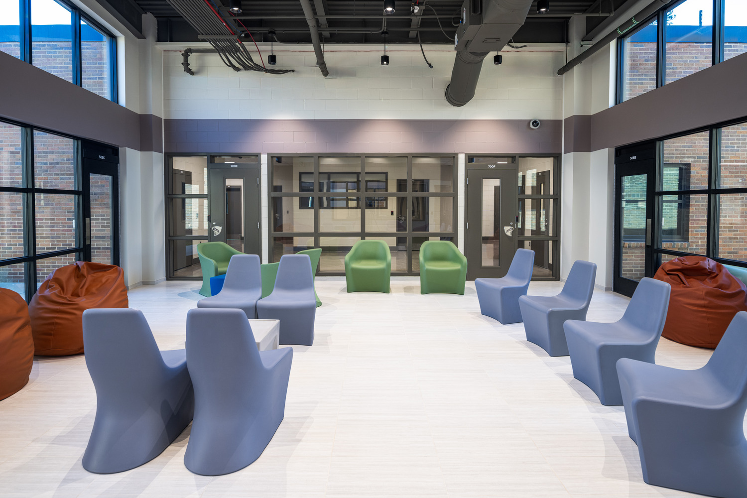 To prioritize resident well-being and staff efficiency, the design relies on proven, evidence-based strategies that elevate traditional correctional standards. A dynamic central activity hub featuring acoustic clouds and multi-purpose areas supports education and group treatment, while color-coded patient corridors in calming blue and purple tones improve wayfinding and enhance the overall healing environment. Functionality and safety are integrated through the use of individual rooms to eliminate multi-occupancy risks and the implementation of anti-ligature elements throughout the space. Recognizing the therapeutic importance of nature, the facility incorporates secure exterior spaces, including gardens and courtyards with dedicated lounge areas. By combining efficient spatial layouts with well-documented color psychology and rigorous risk mitigation, the final facility meets all safety and regulatory objectives, protecting the client’s investment while providing a foundation for meaningful behavioral recovery.