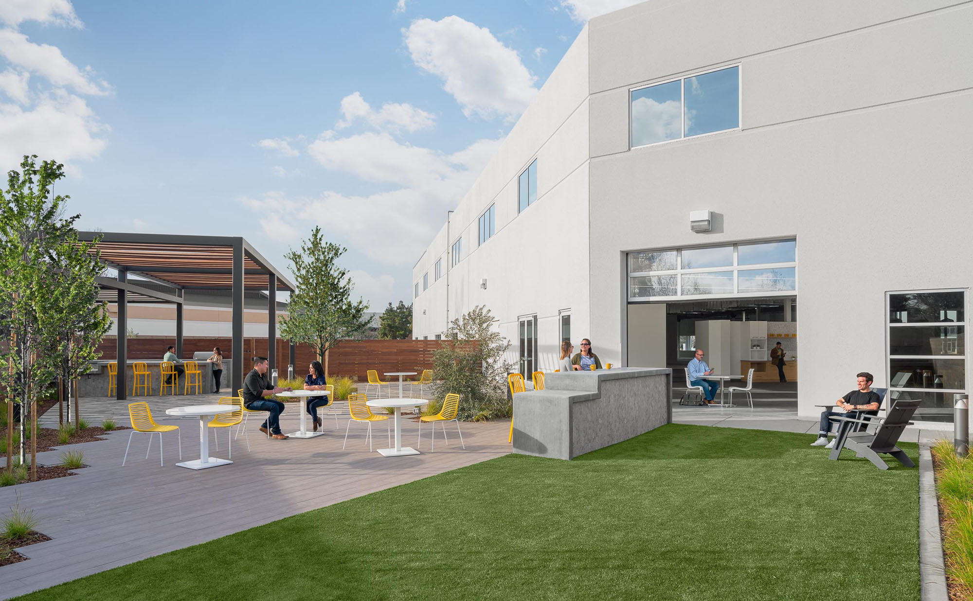 New amenities for employees and guests include a spacious outdoor gathering spot with a shade structure and lounge seating accessible from a glass roll-up door that opens from the indoor break area. The building also features fully upgraded restrooms with new fixtures, accessories, showers, and LED lighting.